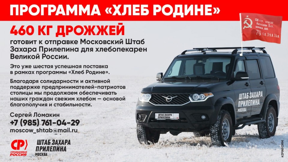 Московский Штаб Захара Прилепина подготовил к отправке очередную партию жизненно важного сырья для хлебопекарен Великой России: 460 кг (нетто) высококачественных дрожжей.